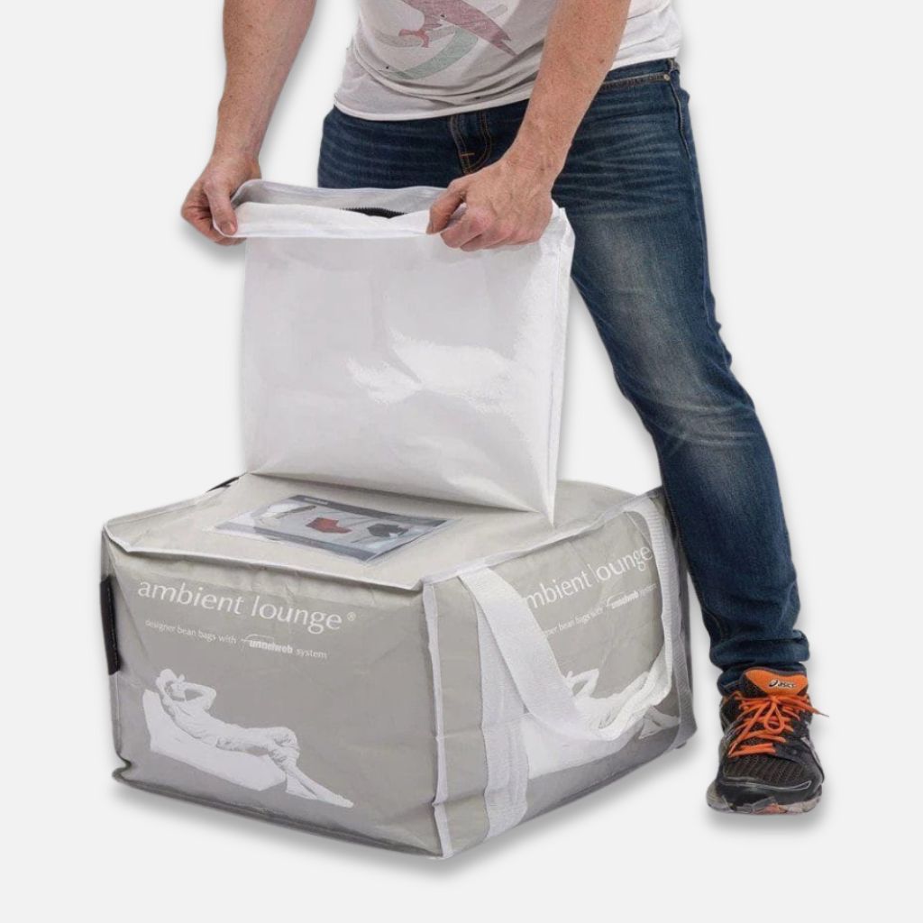 Du behøver ikke længere at kaste massive poser rundt i indkøbscentre, spilde beanbag bønner over hele dit smukke hjem, bryde med plastikposer og få halvdelen af familien til at hjælpe dig med at fylde eller genopfylde en beanbag. Ambient Lounge beanbag fyldning kommer i patenterede Funnelweb ™ Zip & Tips System leveres i en miljøvenlig genanvendelig transportpose direkte til din dør. Det er en enmandsopgave, der er hurtig, praktisk og enkel.