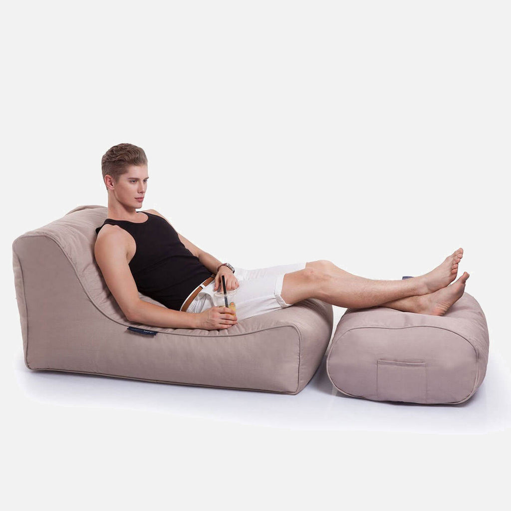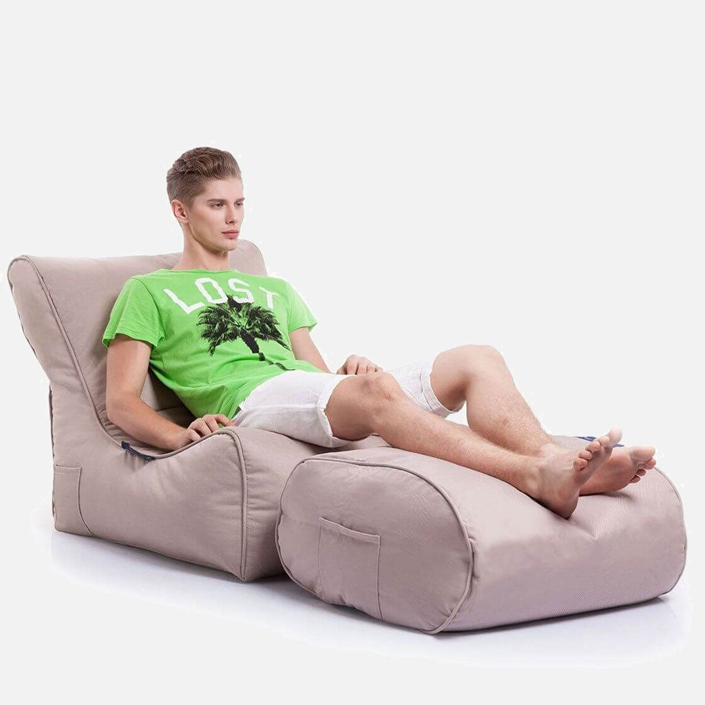 Dette er en sækkestol designet til både indendørs og udendørs brug. Det betyder, at stoffet er designet til at modstå vejr og vind samt være behageligt at sidde på.