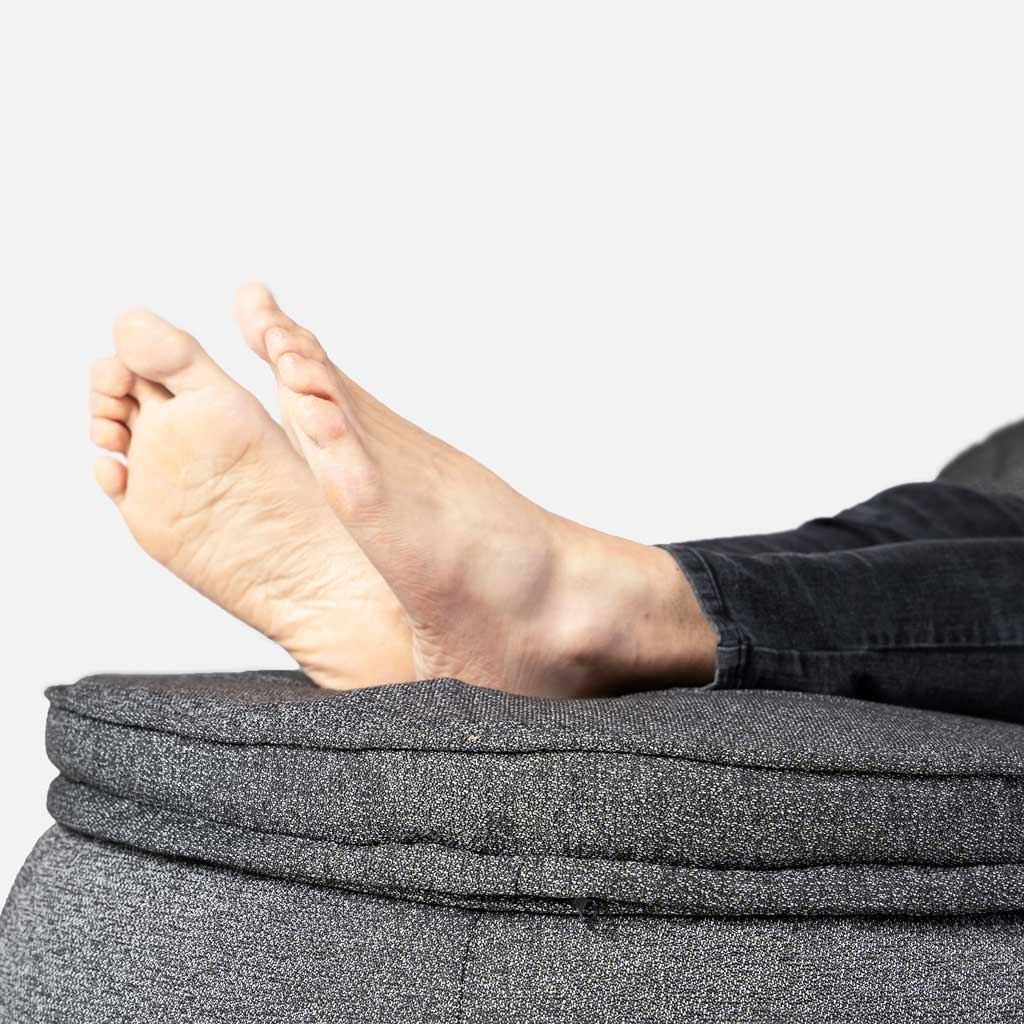 Den unikke Wing Ottoman har omtrent 90 liter Premium Fyld. Wing Ottoman skal fyldes tæt, så toppen er fast, men flad nok til, at Memory Foam-toppen let kan låses med lynlås.